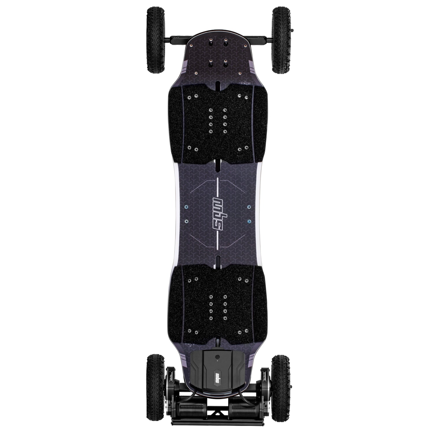The MBS AGENT AIR electric mountain board -fitted with industry-standard lightweight MBS T3 tires on MBS Rockstar II hubs. Choose the 540Wh top-mounted quick-swap battery to be as light as possible for jumping and ultra responsive on the trail.